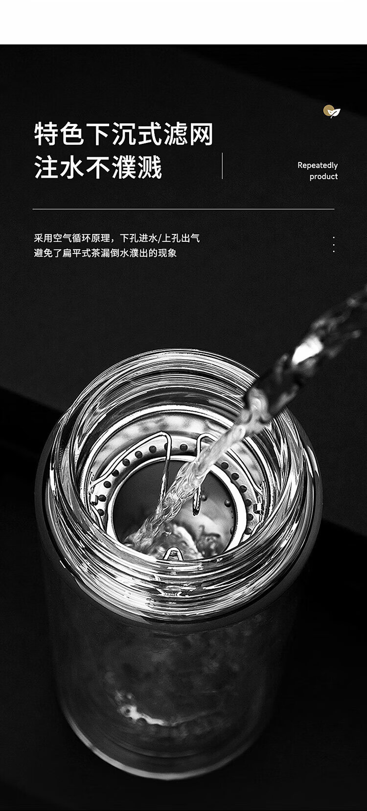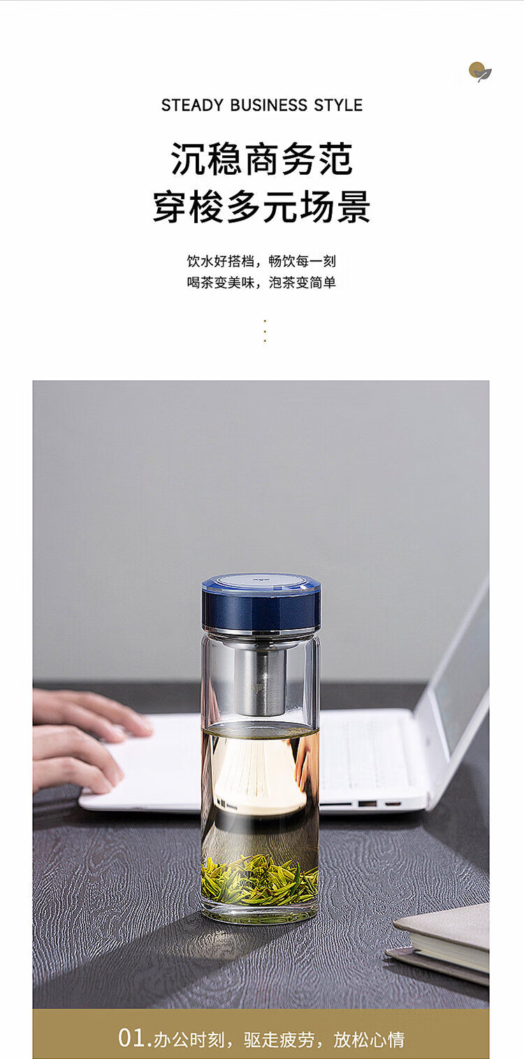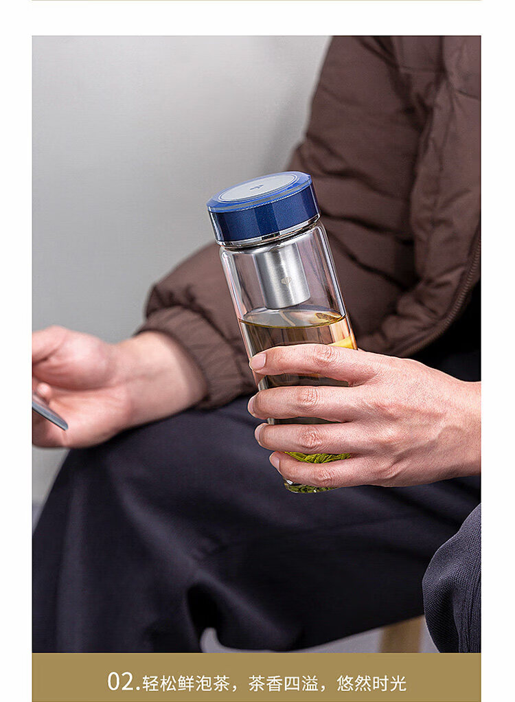 希诺(heenoor)茶水分离玻璃杯男女士双层大容量便携车载杯子隔热茶杯商务泡茶杯 XN-6662-300ML本色 送杯刷